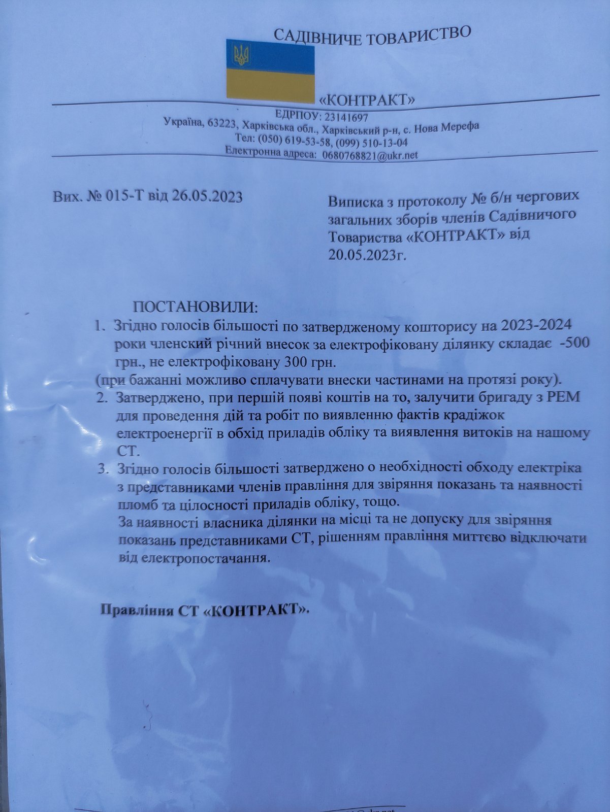 31 січня 2024 року на засіданні Правління СТ "Контракт" було прийняте рішення щодо попередження та недопущення крадіжок електроенергії в обхід приладів обліку.